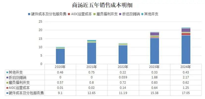 首先是毛利情况,从软件服务为主、到构建和维护算力中心持续投入的硬件成本、运营成本、折旧及摊销成本,令商汤的销售成本从2020年的10.14亿元翻倍至2024年的21.52亿元。