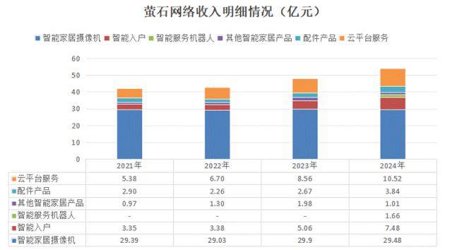 但进一步拆解其收入结构,就会发现,其核心产品一直都是智能家居摄像机,2024年萤石以1831万台出货量蝉联全球出货量最高的摄像头企业,产生的5.38亿元收入贡献公司总收入的54%。