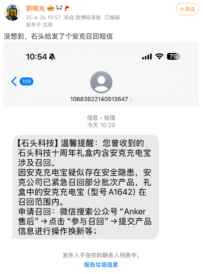 博主 “郭晓光” 发布微博称收到石头科技发来的短信提醒,告知礼盒中的安克充电宝涉及召回,并详细介绍了召回流程