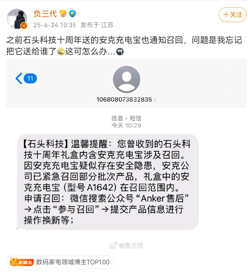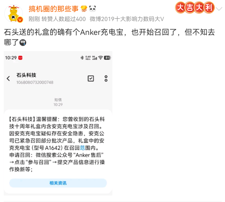博主 “搞机圈的那些事” 称石头送的礼盒中的安克充电宝开始召回,但已不知去向。
