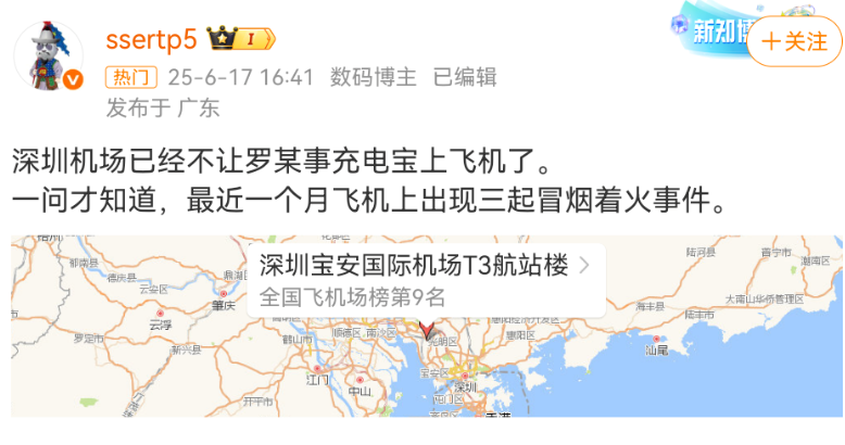 6月17日,博主“ssertp5”发微博称深圳机场已经不让罗马仕充电宝上飞机了,原因是最近一个月飞机上出现三起冒烟着火事件。