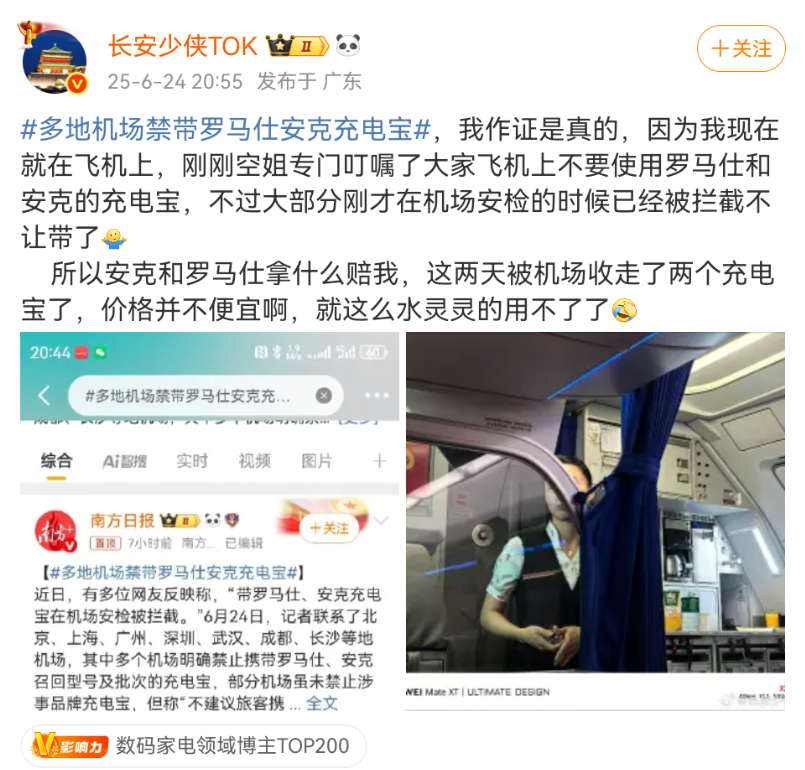 6月24日,博主“长安少侠TOK”表示,自己在飞机上听到空姐专门叮嘱不要使用罗马仕和安克的充电宝,而在机场安检时,大部分涉事充电宝已被拦截。