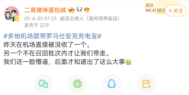 6月25日,博主“二黑猪咪面包绒”也称自己在机场的一个充电宝被没收,另一个因不在召回批次内才被允许带走。