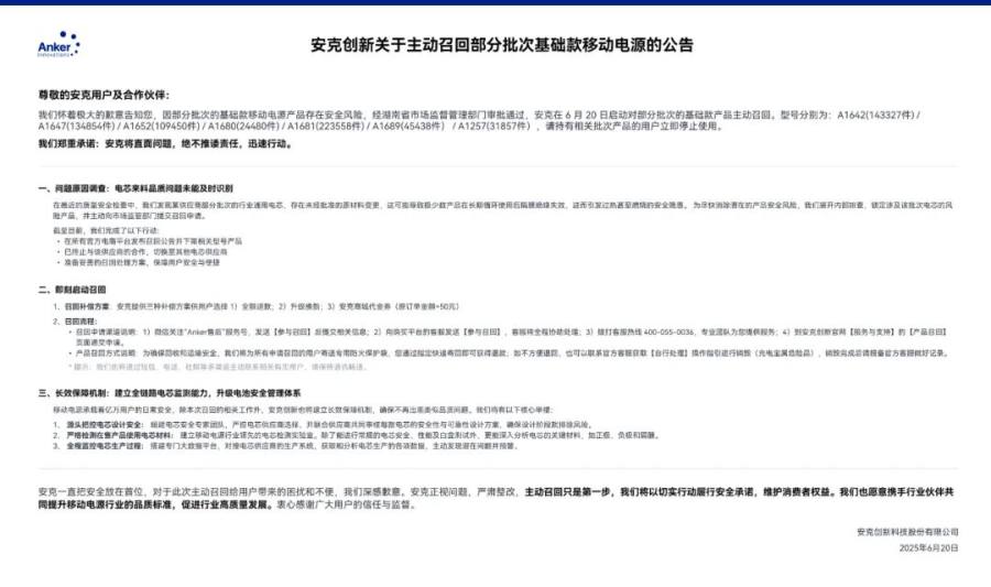 6月20日,安克创新发布公告,宣布主动召回型号为A1642/A1647/A1652/A1680/A1681/A1689/A1257的部分批次基础款移动电源,原因是某供应商的行业通用电芯存在未经批准的原材料变更,可能导致隔膜绝缘失效,进而引发过热、燃烧的安全风险。