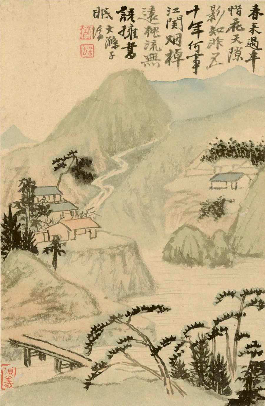 江岸春尽,山烟如织,村舍掩映,松枝交横。石梁跨水,野屋临坡,溪光斜照,淡泊成趣。