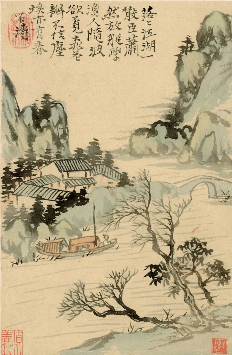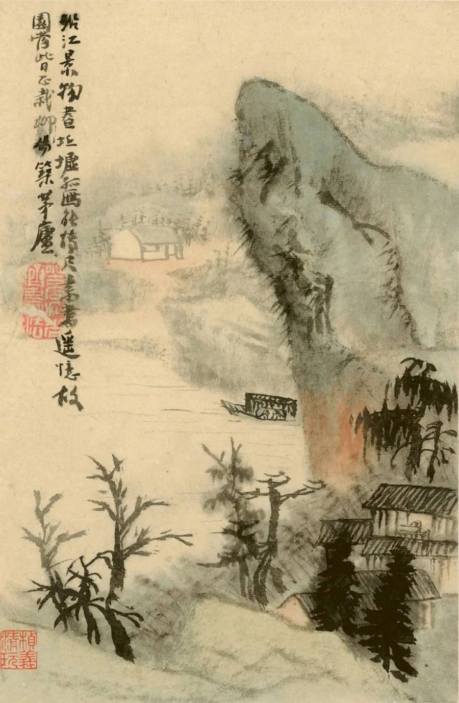 图中山远水迴,舟行云底。或苍林夹岸,渔樵相望;或沙渚微茫,人烟散淡。时有孤舟,帘卷斜阳,旅思纷然。又有烟村短棹,酒市人闲,竹篷桃叶,野渡无声。笔痕淡宕,设色温润,如梦初醒,若思犹远。大江东去,人心南归,石涛之志,尽在斯图矣。