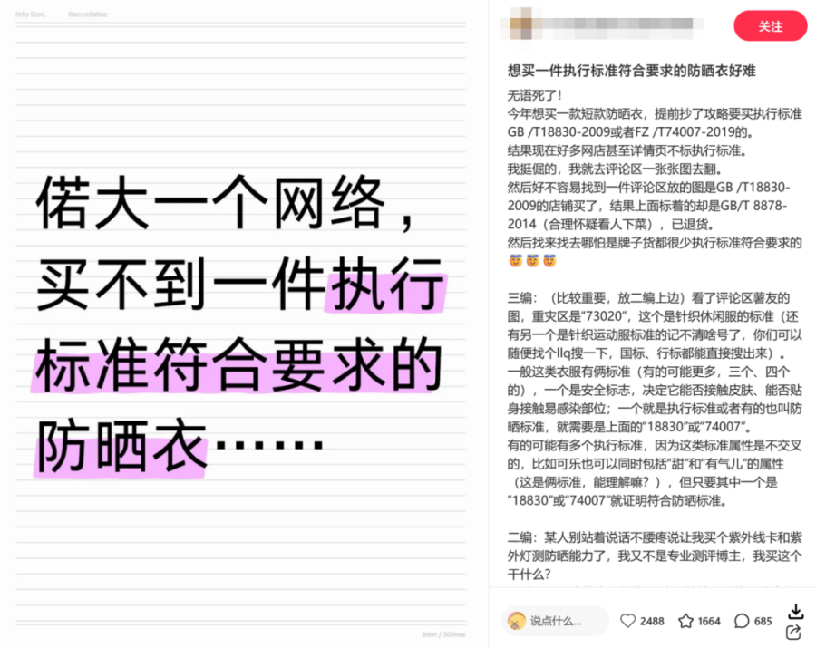 乱象频出,以至于有消费者感叹:“看了一堆标准参数,结果偌大一个网络,还是买不到一件执行标准符合要求的防晒衣。”