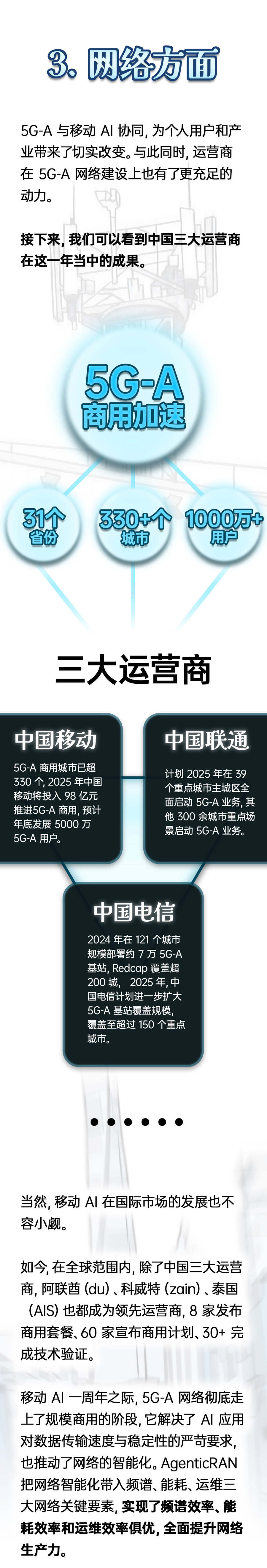 移动AI时代也将给网络智能化带来新的机会。比如说我们看到AgenticRAN把网络智能化带入频谱、能源、运维三大网络关键要素,实现频谱效率、能源效率和运维效率俱优,全面提升网络生产力。