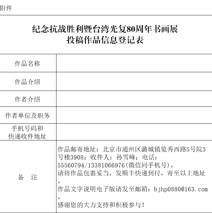 1.所有投稿作品展览结束后退还作者。 2.主办方有权对入选作品进行展览、出版、宣传等非商业用途的使用。 3.凡投稿者视为认同并遵守本通知要求。 4.作品邮寄地址: 北京市通州区潞城镇览秀西路5号院3号楼3908;收件人:孙雪峰;电话:55560794/13381066976(微信同手机号)。 作品文字说明电子版请发至邮箱:bjhp0880@163.com。 请将作品包裹妥当后,发顺丰快递到付,寄至以上地址。 感谢您的大力支持和积极参与!
