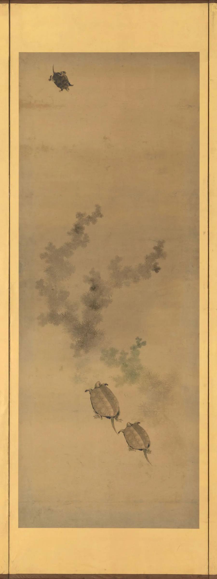 碧草如烟,水痕不现。三龟缓行,随波而游。壳纹细致,足迹轻微,仿佛春风过水,不留一痕。其上者孤游远处,微昂首,望彼空渺如幻;其下二者并肩而行,不语而从,情在形外。