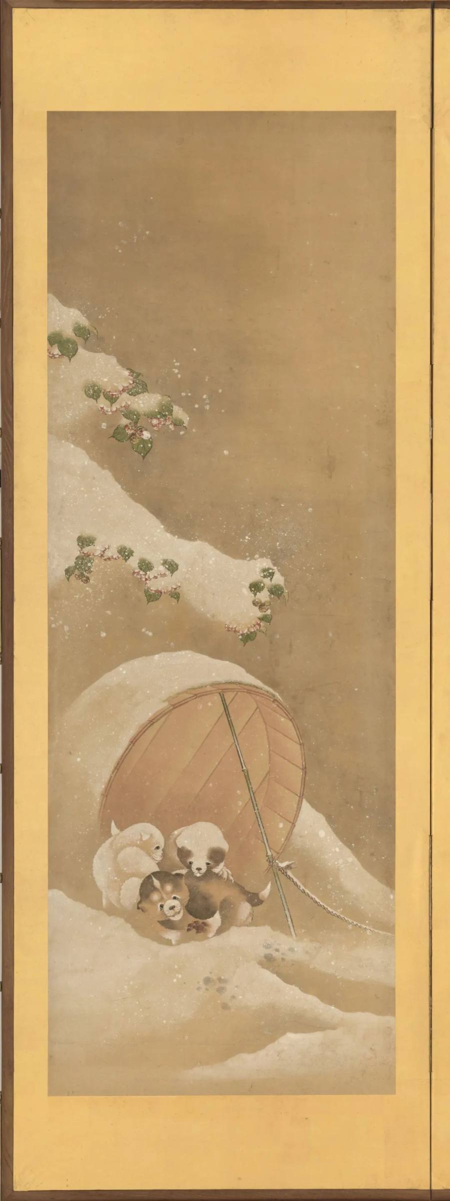 枝上红绿,雪中黄褐,伞下粉白,色泽错落,章法有度。非绚丽之笔,胜天工之工。画中虽静,意却流转;狸虽微形,情却深藏。万象收笔下,一伞纳温柔。