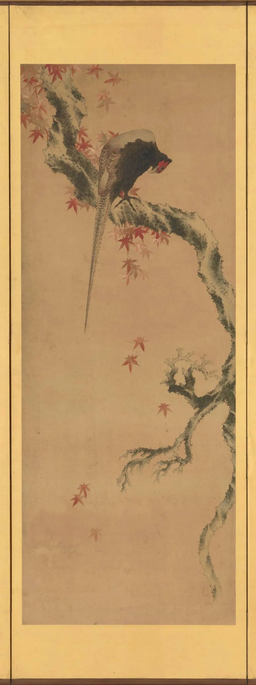 锦鸡独栖,身披斓羽,尾垂尺余,若流绡轻带。目凝不瞬,喙启未语,似有幽思藏于暮意。红冠初挺,映枫而生光;羽翼含姿,临风而静对。禽栖不语,枝不摇声,一境之中,四野皆沉。