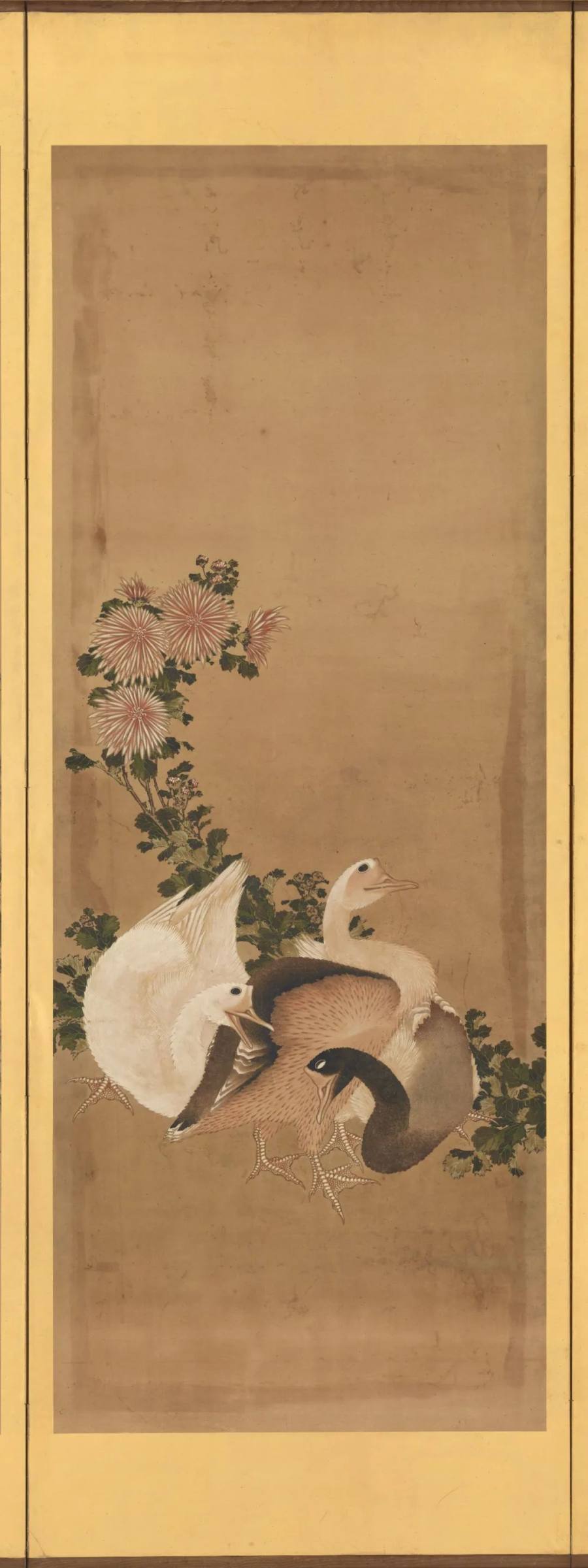 鹅群倚花,五羽成行。其一昂首,似对高云言志;其二低回,若同幽草诉情;其三顾影自怜,其四凝目如思,其五曲颈伏地,羽色如锦。啄羽而洁,振翅而静,立于菊下,不惊风露,似与草木同气。白羽照地,棕羽衬影,爪印微痕,足下有痕亦无声。