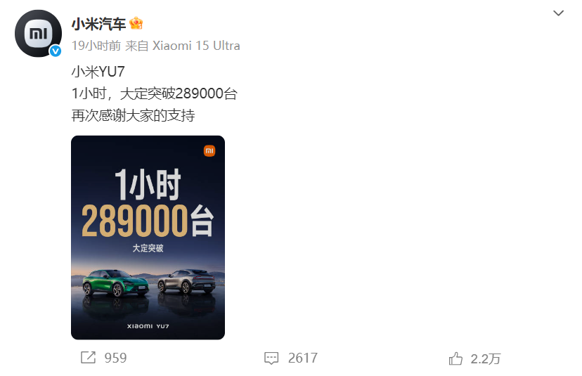 相较小米集团的首款汽车SU7,YU7的成绩更加惊艳。发布会后3分钟大定突破20万台,1小时突破28.9万台,开售18小时,锁单量突破24万台。