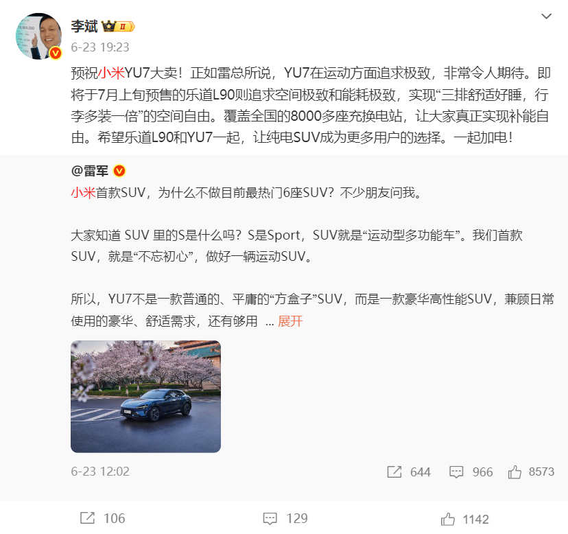 外界的讨论并未影响雷军深耕汽车行业的野心。6月23日,雷军发文称,小米“制定了‘离谱’的目标:小米YU7要继续挑战Model Y!”