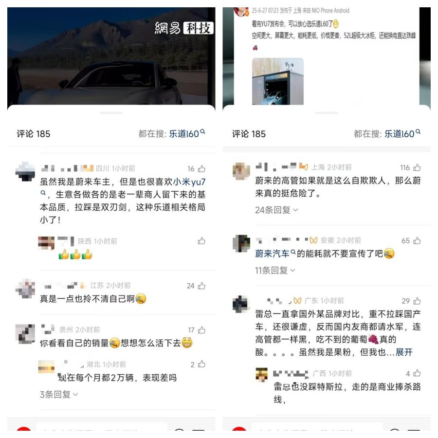 毫无疑问,李斌对小米汽车的态度是支持,但小米YU7发布后,蔚来高管却疑用“拉踩”的方式,为自家汽车营销,打了李斌的脸。6月27日,蔚来高级副总裁兼乐道汽车总裁沈斐也借势营销,其在社交平台表示,在观看了小米YU7的发布会后,消费者可以放心选择乐道L60了。其列举了乐道L60的几个优点,更大的空间、更大的屏幕、更低的能耗、更优惠的价格以及52L的超级大冰柜,并强调其换电功能可以直达珠峰。对此,有网友在评论区质疑沈斐“情商低”“拉踩”,还称乐道“格局小了”。