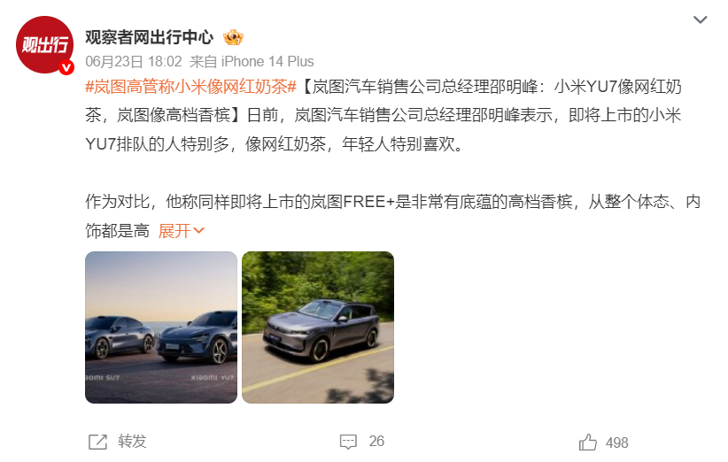 此外,也有部分友商对小米SU7存在不同的看法。小米YU7发布之前,岚图汽车CBO、销售公司总经理邵明峰在公开场合表示,小米YU7好像网红奶茶,排队的人特别多,年轻人喜欢的感觉。而岚图的产品,特别是岚图FREE+,好像高档香槟,是非常有底蕴的,整个给人的感觉是高端奢华有内涵的。
