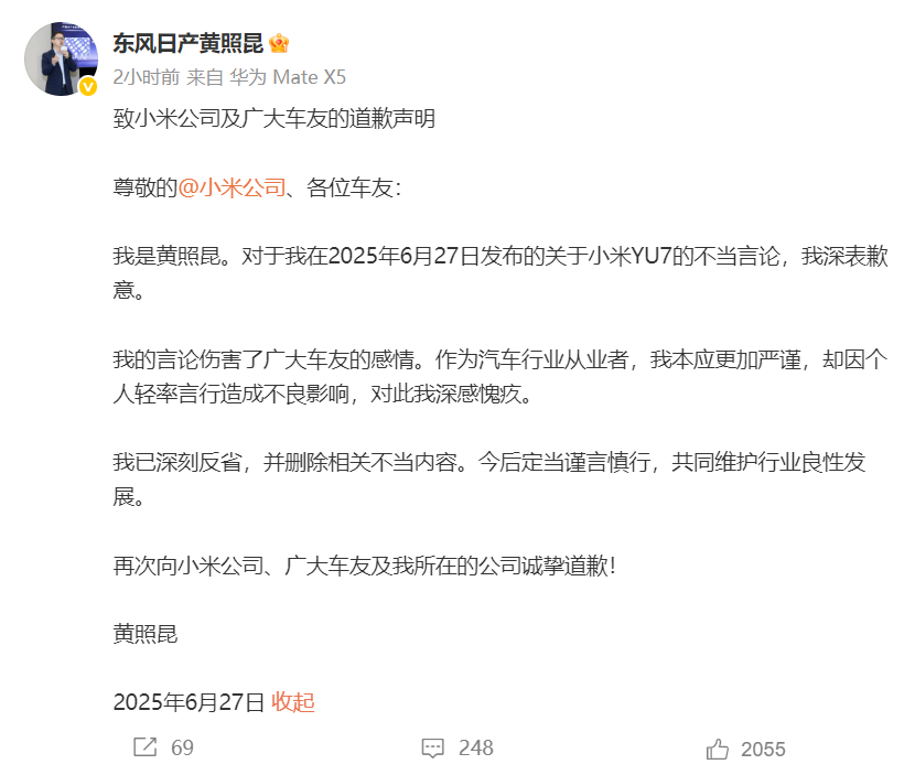 6月27日下午,黄照昆发布了道歉声明,称就之前发布的不当言论向小米公司、广大车友以及东风日产诚挚道歉,今后定当谨言慎行,共同维护行业良性发展。