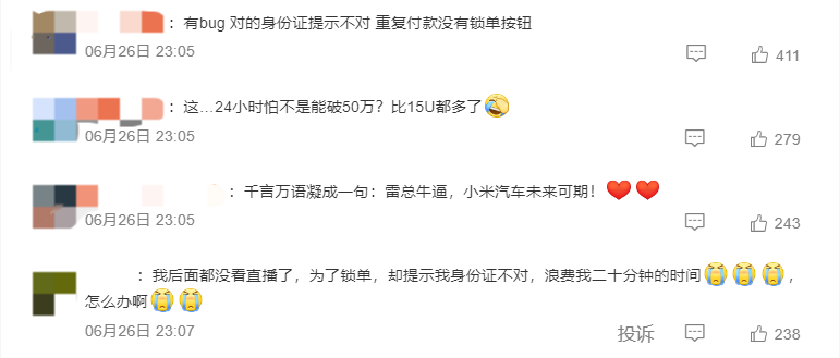 与此同时,还有网友反馈大定时遇到的问题,“提示身份证不对”,“重复付款没有锁单按钮”等。