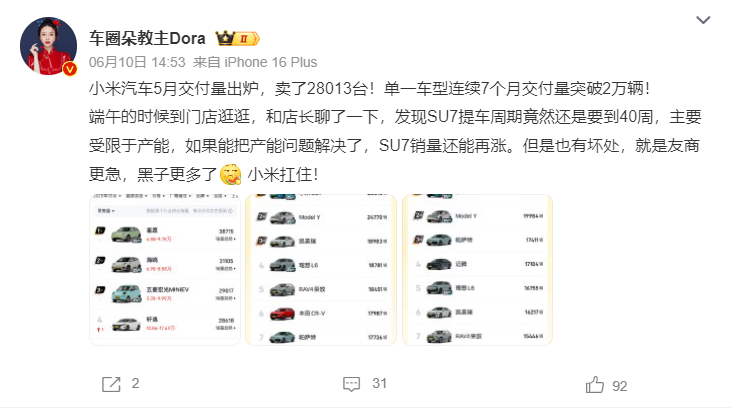 有小米汽车门店店长告诉“车圈朵教主Dora”,端午节前后,小米SU7提车周期需要40周,主要受限于产能。如果能把产能问题解决了,SU7销量还能再涨。