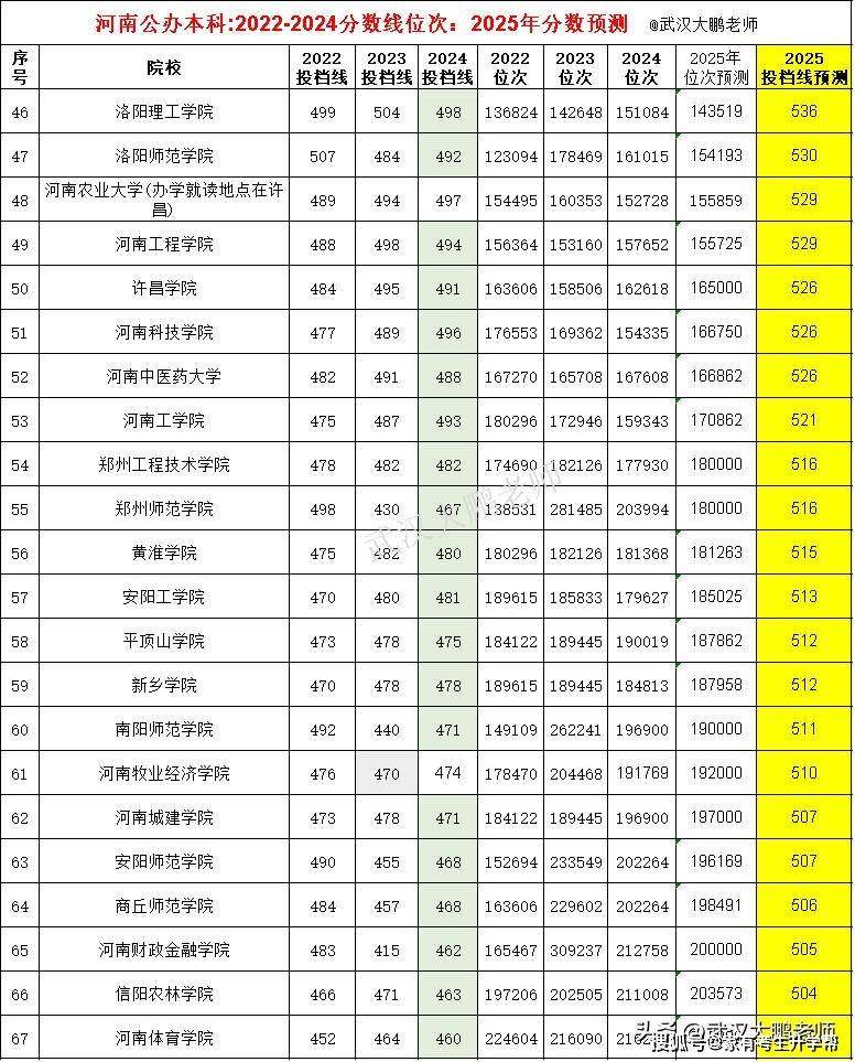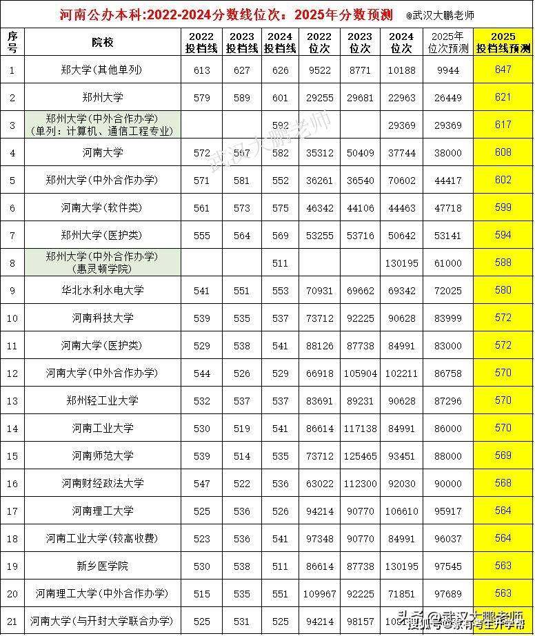根据河南省内本科院校近4年录取分数线、位次对比,结合2025年分数位次,预测分析2025年省内高校分数线。仅供考生家长参考。