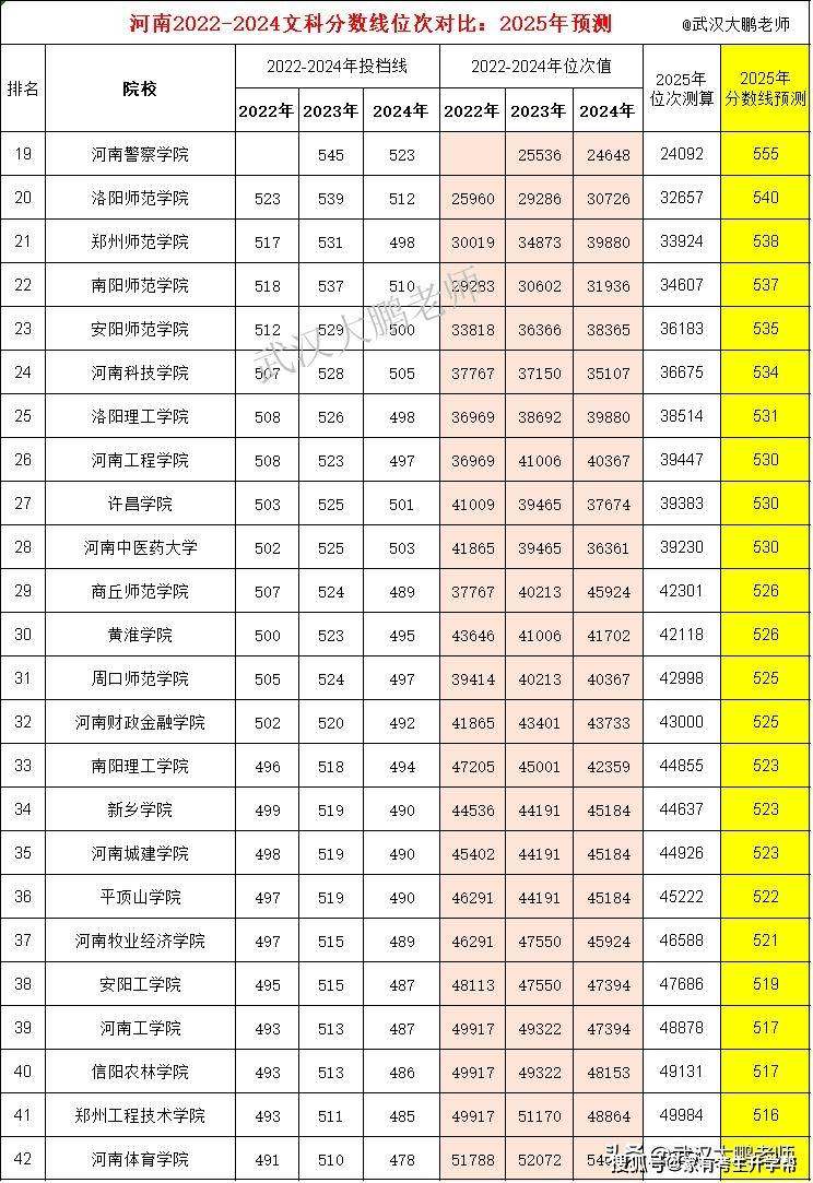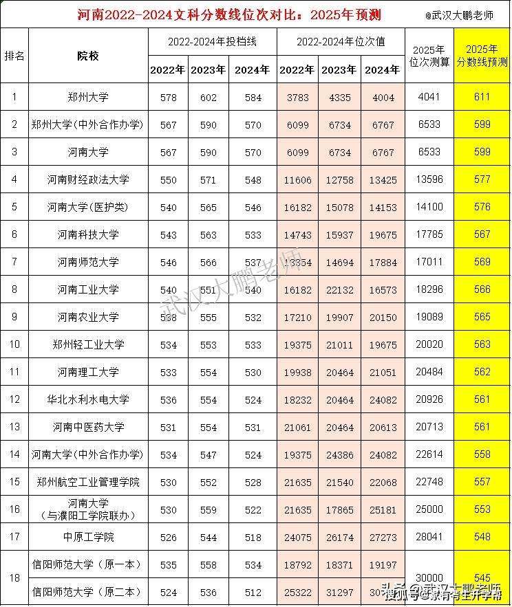 2022-2024年河南文科:公办本科分数线位次,及2025年分数线测算。
