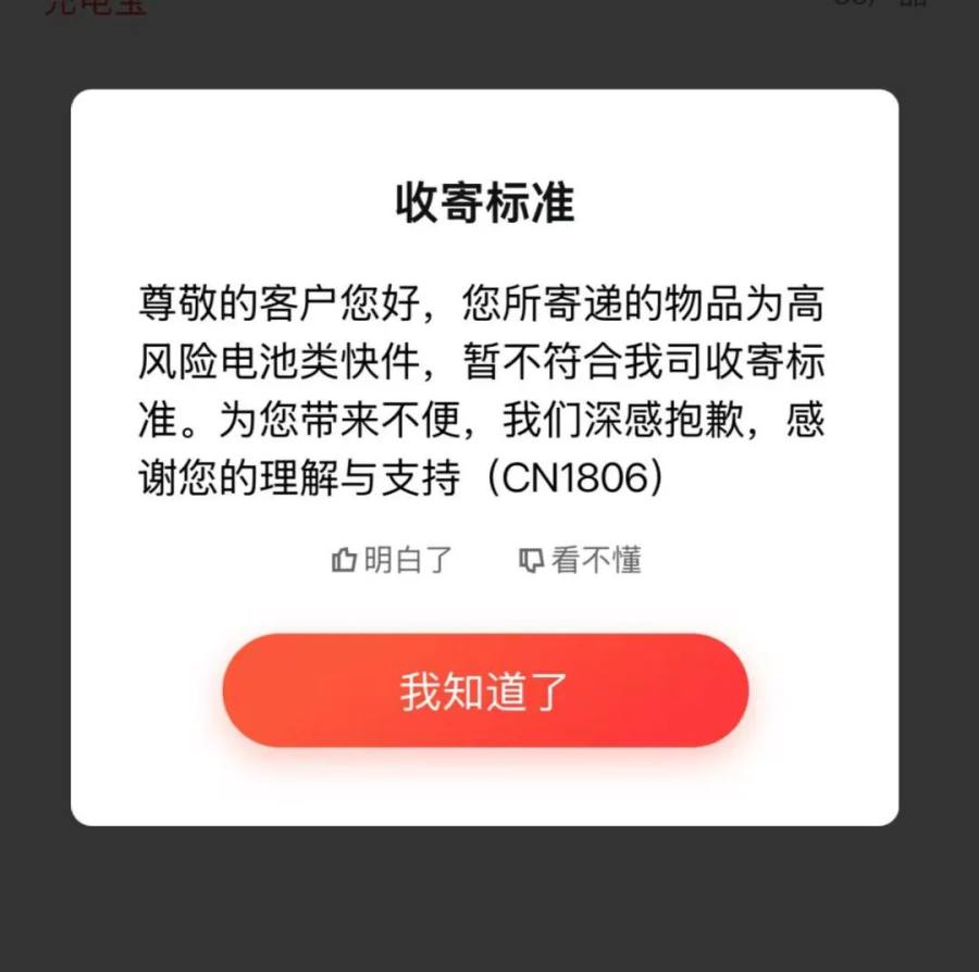 多个位于北京的消费者透露,目前在大兴机场邮政和京东可以邮寄充电宝。市内顺丰、中通等多家快递公司都不接收充电宝订单。在填写订单时,会自动跳出弹窗,显示为高风险类产品,不符合快递运送标准。