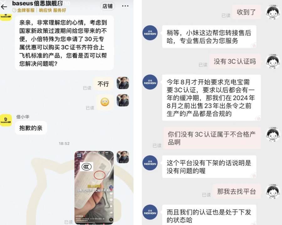 而那些未在召回批次的充电宝,消费者们则陷入了退款难。在社交平台上随处可见,与客服拉扯的故事。一位消费者申请退款后,客服以3C认证的实施时间为由,强调即使没有标识,产品也没有安全质量问题,拒绝退款。另一位消费者,则得到“没有下架,就是没有问题”的回复,客服只愿意赔付30元。