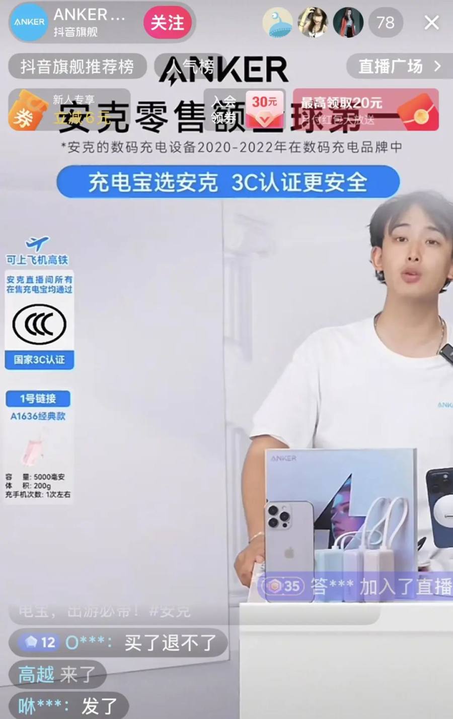 在安克创新抖音直播间内,背景板和直播间左侧显著位置都有标注,“充电宝选安克,3C认证更安全”,以及“可上飞机高铁”,有“国家3C认证”等标识。直播间弹幕也在持续滚动,“安克充电宝,有3C认证,可上飞机高铁”。