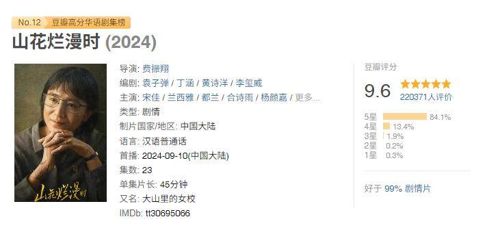 去年秋天在播出期间,《山花烂漫时》在社交平台上不断积累观众口碑,凭借细腻扎实的现实主义表达和极高的完成度,逐步攀升至豆瓣9.6分,成为过去九年来评分最高的国产剧。这部作品没有流量演员加持,也不依赖极端情绪制造戏剧张力,却以人物和情感本身打动了大量观众,引发了关于教育、女性命运与真实力量的深度讨论。