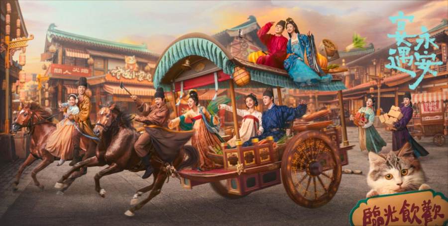 《宴遇永安》则是一次更轻盈、更亲和的创作尝试。剧中设定为一家人“集体梦回古代”,通过一家人的古今切换,串联起市井风貌、美食文化与爱情表达,用轻喜结构展现了更生活化的叙事维度。与当下流行的“女主快穿”模式不同,这部剧选择的是“家庭群像+文化焕新”视角,尝试将传统文化的瑰丽与现代情绪结构融合进一套温暖、有趣且富有审美密度的表达语境中。