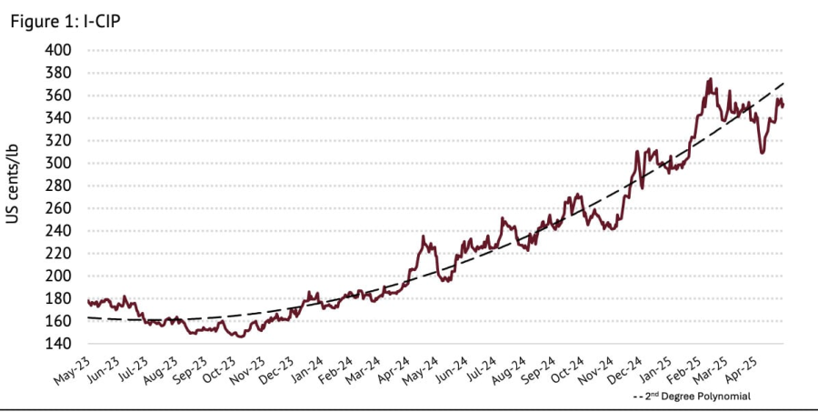 从月度数据来看,2025年4月I-CIP平均价格为每磅335.76美分,虽较3月环比下降3.5%,但同比2024 年4月增长54.8%。此外,12 个月滚动平均价格为每磅278.20美分。