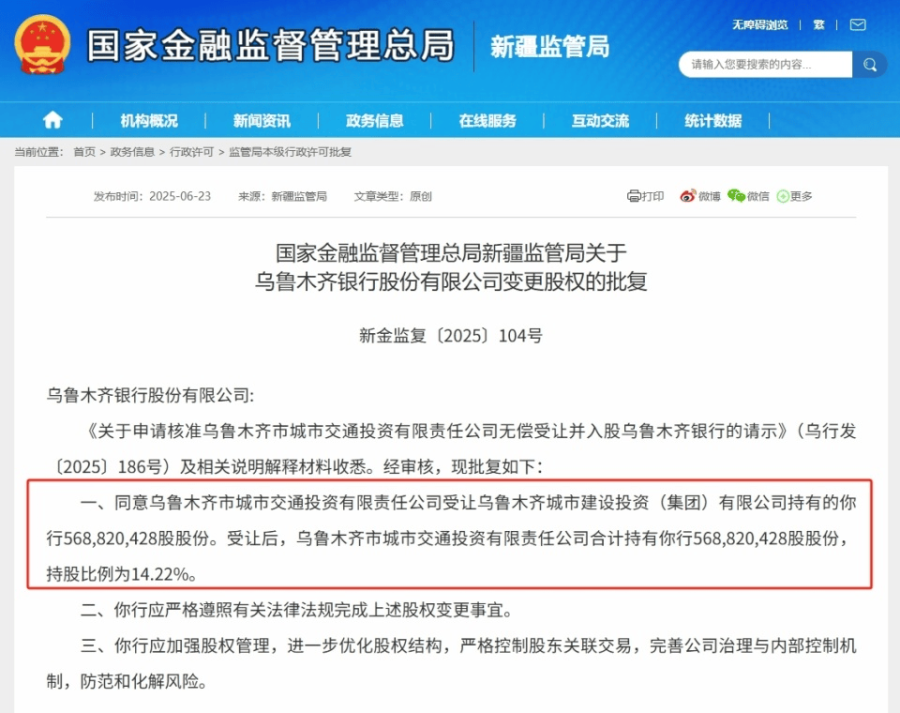 近日,国家金融监管总局新疆监管局网站公告,同意乌鲁木齐市城市交通投资有限责任公司(简称“乌鲁木齐城交投公司”)受让乌鲁木齐城市建设投资(集团)有限公司(简称“乌鲁木齐城投集团”)持有的乌鲁木齐银行568,820,428股股份,即14.22%股权。