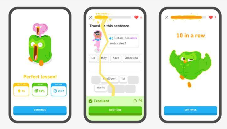 多邻国最为人津津乐道的是其游戏化的学习机制,让不少用户感到了“无痛学习”的乐趣。整个语言的学习过程,更像是一个个小的游戏环节,用户在动画式的互动中完成词汇和语句、口语等的学习。这是多邻国和众多语言学习产品最大的区别。