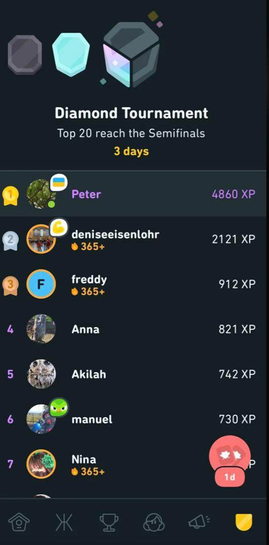 除了通过游戏化设计降低学习门槛,多邻国的社交功能也是其维持用户粘性的重要手段,用户可以在app中看到自己的学习成果在朋友中的排名。通过这种暗戳戳的较劲,很自然的刺激了用户持续活跃和深度使用,同时“友圈排名”获胜者则获得了很大的情绪满足。