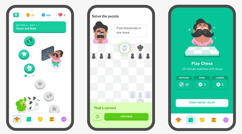 在稳固语言学习基本面后,多邻国在2022年和2023年分别上线了数学和音乐课程。2025年又上线了国际象棋课程——根据官方说法,这是一款由个人兴趣项目发展出来的受用户欢迎的产品,借助AI的能力,用户在象棋玩法中可以获得丰富有趣的学习体验,目前用户量在快速增长中。