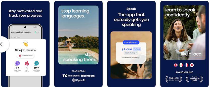 其中特别值得关注的是Speak,这是一款在功能上和Duolingo几乎全面竞争的产品。借助AI,在在2023年获得了非常大的关注,在多个国家的商店排行榜上甚至超越了多邻国。