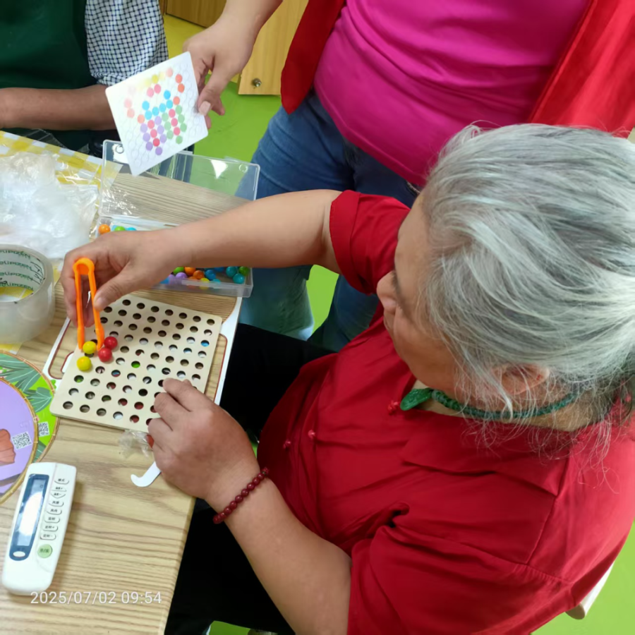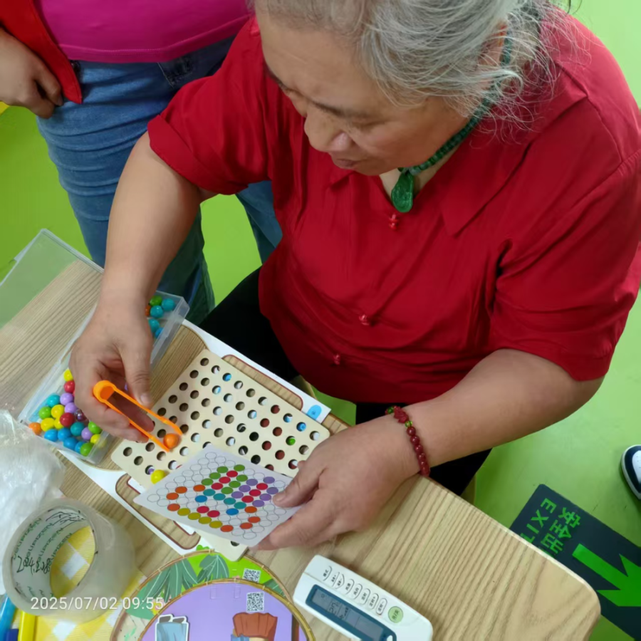 还开展了益智类的活动,画面里,老人身着红衣,专注于手中的棋盘。她按着图案进行操作,拿起夹子夹起彩色珠子,依着图案进行摆放。看似简单的动作,实则锻炼着手部精细动作,考验着专注力与耐心,也在色彩与空间的对应中,唤醒认知活力,于点滴间勾勒出晚年的充实与精彩。