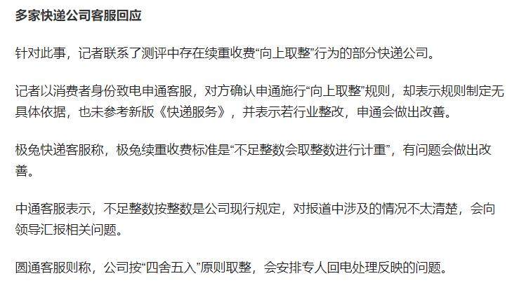 对此,申通、极兔、中通、圆通客服回应称确实存在向上取整,申通表示行业整改申通则改,极兔表示有问题会改,中通说会向领导汇报相关情况,圆通会安排专人处理问题。