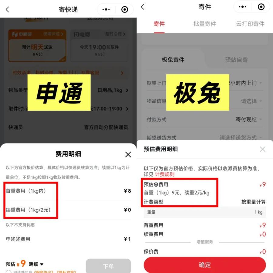 调查发现,申通续重以1kg为计重单位,不足1kg按照1kg收取续重费用;极兔在计费规则中明确表示,采用向上取整的方式,1.1kg计重2kg;