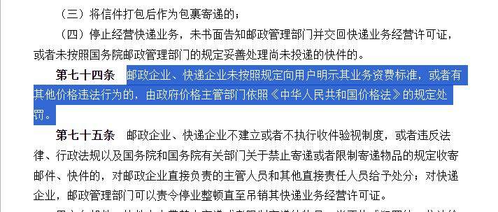 《中华人民共和国邮政法》第七十四条规定,邮政企业、快递企业未按照规定向用户明示其业务资费标准,或者有其他价格违法行为的,由政府价格主管部门依照《中华人民共和国价格法》的规定处罚。