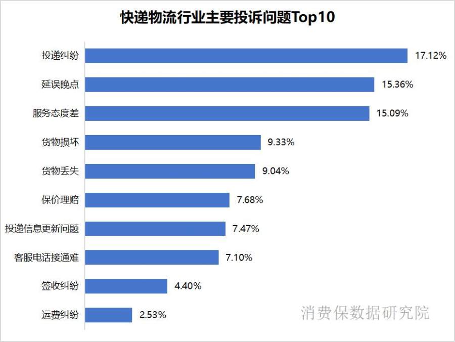 近年来,快递消费乱象频出,与之相关的消费投诉也随之上涨,货物损坏、货物丢失、物流信息纠纷、服务态度差等问题层出不穷。