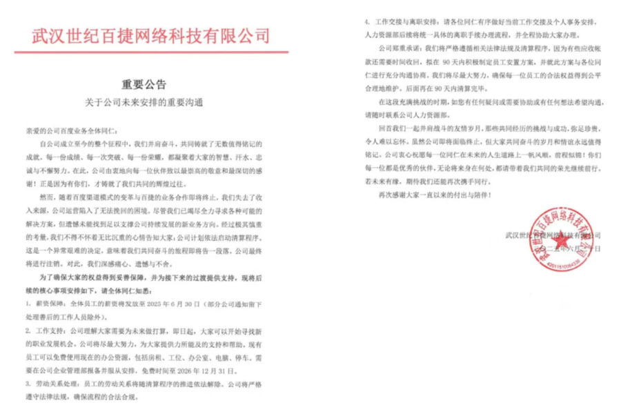 没有一点征兆,百度在湖北地区的总代理商武汉世纪百捷网络科技有限公司于6月30号发布声明,全体员工工资发放至2025年6月30日,公司将在未来半年完成破产清算。这家在湖北互联网营销领域活跃了22年的巨头走到了终点。
