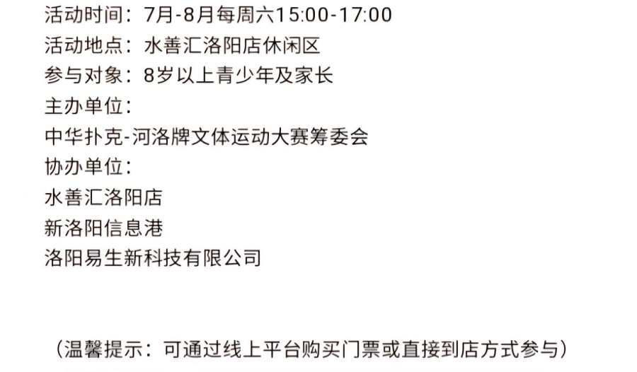 本次暑期特色文教活动由中华扑克-河洛牌文体运动大赛筹委会牵头,联合洛阳易生新科技有限公司、新洛阳信息港等多家单位共同举办,地点设在水善汇洛阳店休闲区。活动以“认识国家非遗河图洛书,入门中华优秀传统文化”为核心,专为8岁以上学生及家长设计,旨在利用暑假时光,让家庭在互动中感受文化魅力。