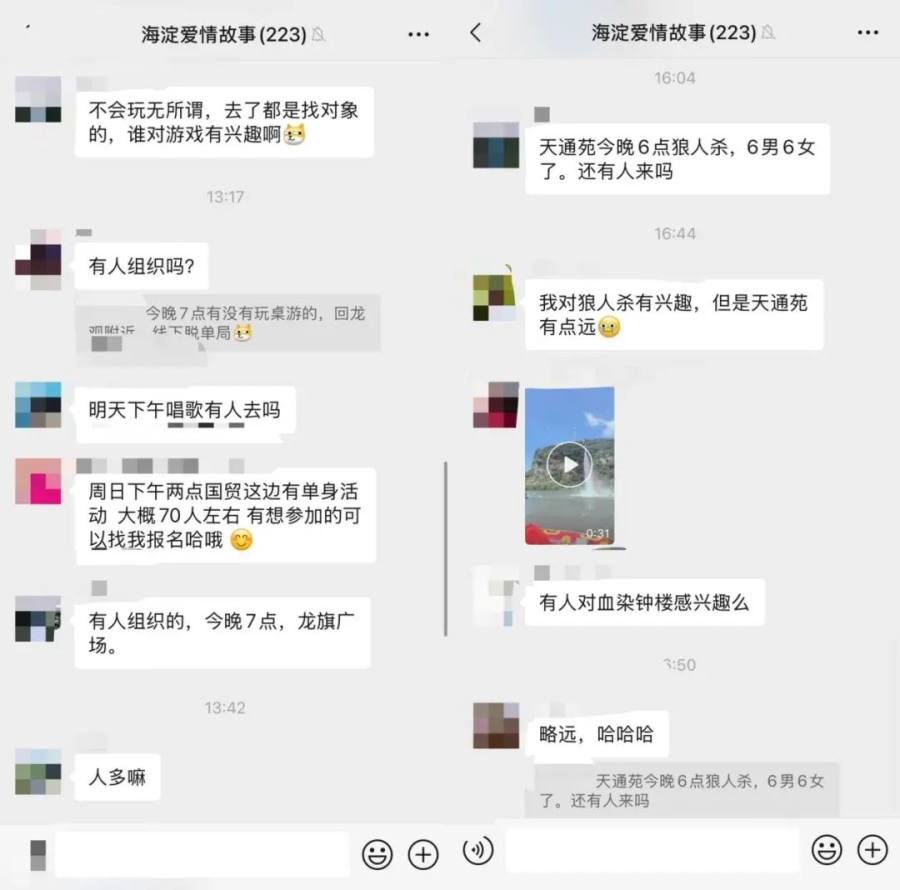 不过应王婆的号召,现场建立了交友群聊。群内很快就发起了各种社交活动,露营、狼人杀、唱K......持续有人发出组团邀请。还有人直接发出自己的相亲信息,寻求有缘人。
