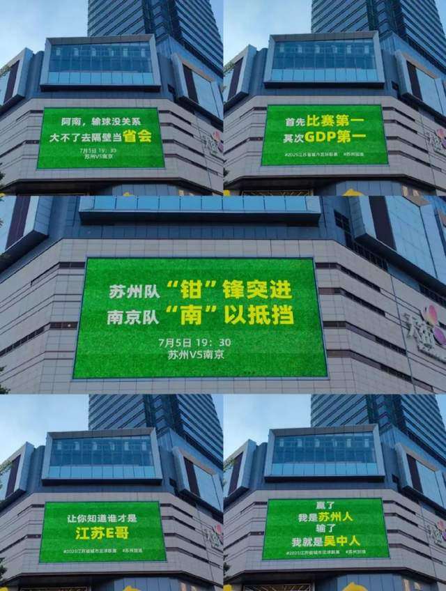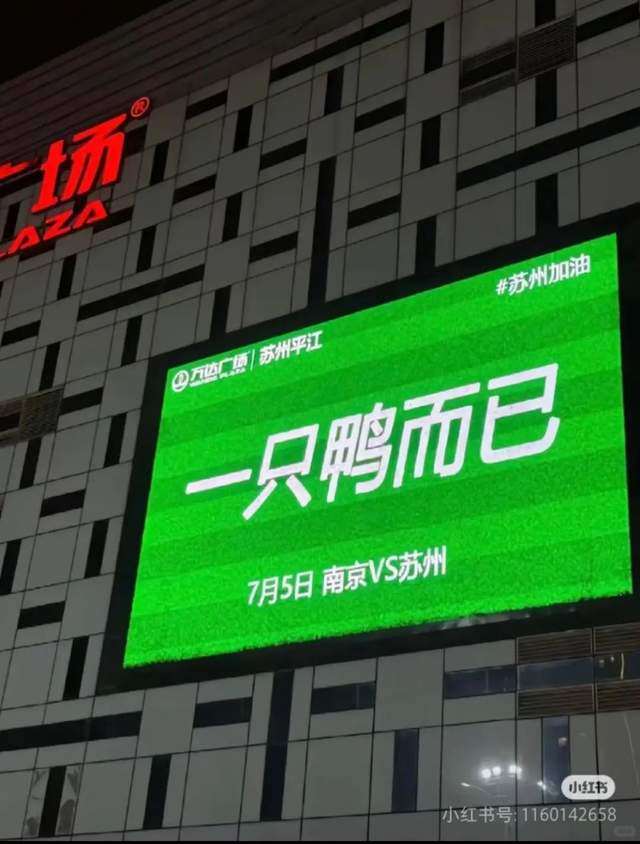 另一边,苏州也开始精神胜利法,例如在商场大屏打出五个简短但有力的大字:“一只鸭而已”(注:南京招牌菜是南京盐水鸭),还有看似安慰实则挑衅的:“阿南,输球没关系,大不了去隔壁当省会”,颇有些“茶味语录”那味儿了。