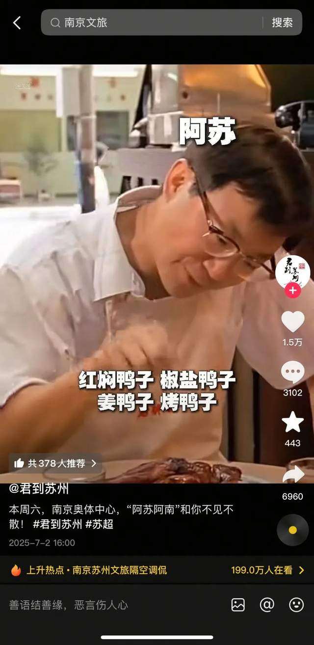 比赛还没开始,抖音平台上的官方“公关战”已经打响。苏州文旅官方“君到苏州”先是发了一则“美食视频”红焖鸭子、椒盐鸭子、姜鸭子、烤鸭子……琳琅满目的鸭子做法,没有对美食的渴望,满满的都是打败“南京盐水鸭”的决心。