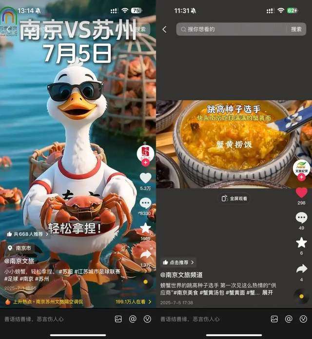 南京电视台“南京文旅频道”回敬一条玩梗视频,视频中的“苏州大闸蟹”一个助跑,下一秒就变成了南京的盘中餐——蟹黄面。配套的文案同样内涵意味十足:“第一次见这么热情的‘供应商’!”南京文旅部门的官方账号“南京文旅”也发了南京盐水鸭手握苏州大闸蟹的AI动画:“小小螃蟹,轻松拿捏,味道好极了!”