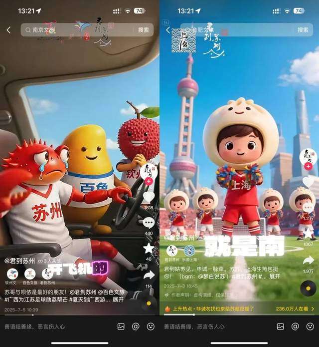 不占主场优势的苏州文旅又另辟蹊径,本着“人多力量大”的核心思想,和邻居上海文旅,广西的百色文旅、钦州文旅都发起了合拍视频,一边让上海玄学施法“南京零”,一边请广西“助荔帮芒”,线下的球赛场地还没布置好,线上的两家文旅部门先打得不知天地为何物了。