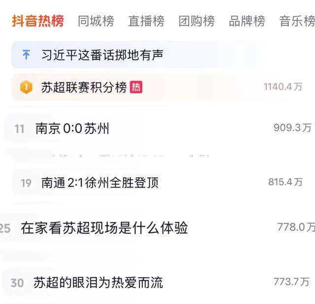 这场新鲜的网络狂欢,也让苏超在这个周末强势霸榜热搜。7月6日的抖音热榜上,多条关于苏超的热搜词条热度高居不下,“苏超联赛积分榜”的词条更是以1140.4万的热度牢牢占据抖音热榜主榜第一。